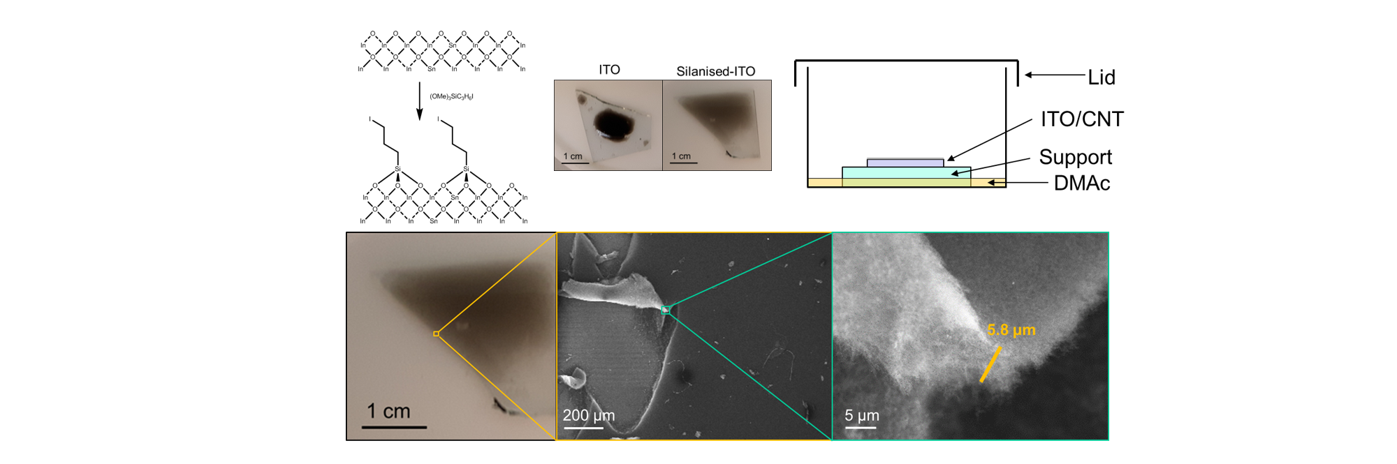 My solution was to silanise the glass with (OMe)3Si(C3H6)I which reacted with the ITO to give dangling iodoalkanes on the surface which would react to the nanotubide and make the surface more DMAc friendly. Now it wet beautifully - so it was solved, right? Well, no. Unfortunately to get the right thickness aerogel, I needed to add just 1.3 μL of gel-forming liquid per 1 cm2 of ITO slide and it dried after a minute or so, before the reaction completed, with drying effects destroying what little structure and porosity I had: there’s a reason you freeze-dry/supercritically-dry aerogels and not just dry-dry them. So how to stop it drying out? Cooling it would slow the drying but not stop the tiny amount leaving over 24h, so instead I exploited vapour pressure. If you saturate the atmosphere around the gel, then it will condense at the same rate it evaporates, so it wont dry out! After the reaction, I supercritically dried it with CO2, and voila! We had a 5.8 μm thick aerogel!