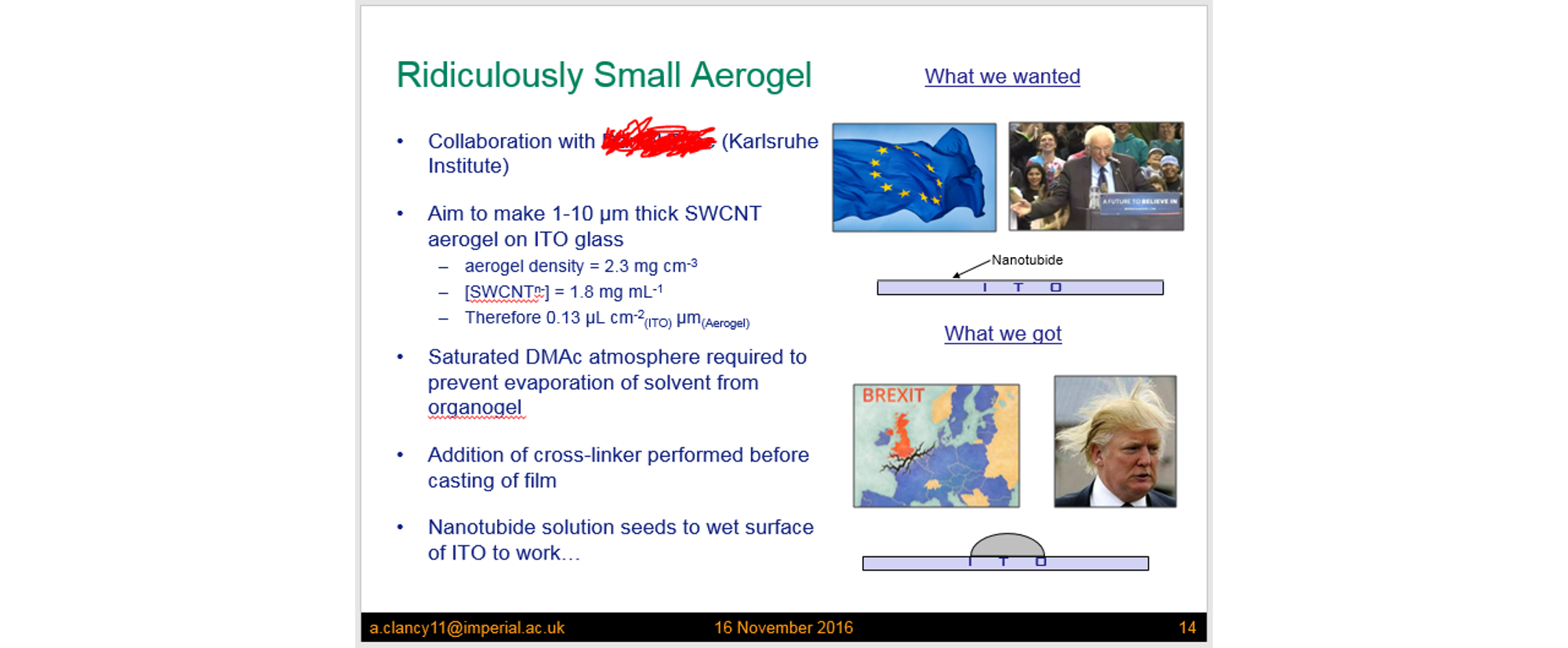 Science can take a really long time. The background to this paper isn’t the longest (I’m currently writing a paper based on data a collaborator took in 2009 and then forgot about), but it has been a long while. My contribution to this paper was mainly in November 2016 to be precise, about 6 years before submission. During my time at Imperial under Milo Shaffer, I had been roped into a collaboration with KIT where they wanted to make nanotube films infiltrated with a molecule for solar cell applications. The film was to be evenly a few nanometres thick, homogenous, and on ITO glass, which was a challenge. My approach was to make a thin aerogel, which could be infiltrated, then squished flat to give the desired film. The aerogel chemistry had been established previously by Martina De Marco, where you mix concentrated sodium nanotubide with di-iodobenzene in DMAc (i.e my favourite solvent) and leave for a day to make an organogel, which can be solvent exchanged and freeze-dried to give the aerogel. These were typically a few cm wide and freestanding however and I needed a few microns on glass. My first attempts to just make the gel-forming mixture on the glass failed however, as it didn’t wet onto the glass and it just made a blob-like droplet. It had failed 1 second in. This was all recorded in my group meeting slides where I compared my failure to Trump and Brexit… not that the next 6 years would make for better news.