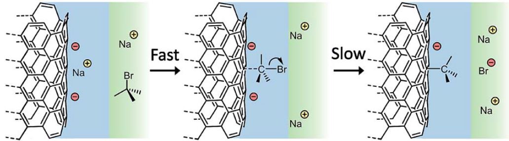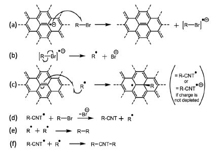 Luckily, all this really meant was I had a year of funding to do something else, and I had an axe to grind with a very minor issue with something generally accepted in my field. See, to functionalise nanotubes, we negatively charge them, e.g. using sodium naphthalide, to give anions of nanotubide, dissolve them in a solvent, then add an alkyl halide, RX. A mechanism for this reaction was proposed years ago by Voiry: a scientist I have never met, with a fantastic portfolio of great work. The mechanism was a throwaway suggestion in his paper, but was broadly accepted to my bewilderment as it just didn’t reflect reality.